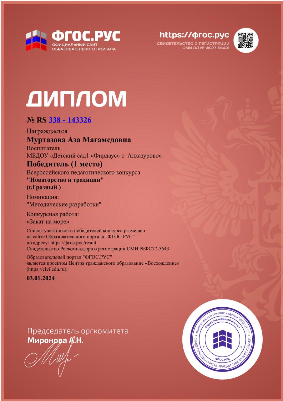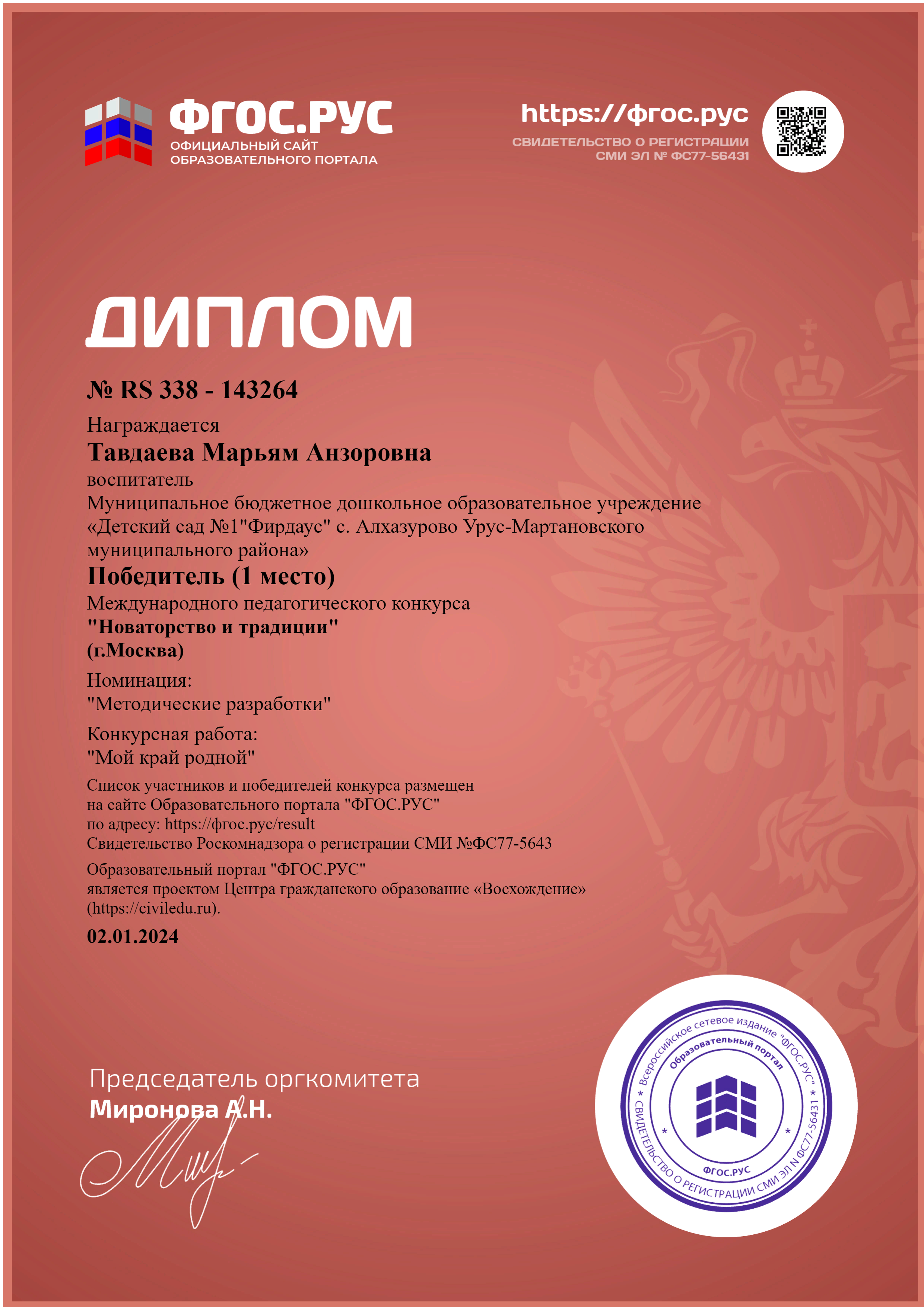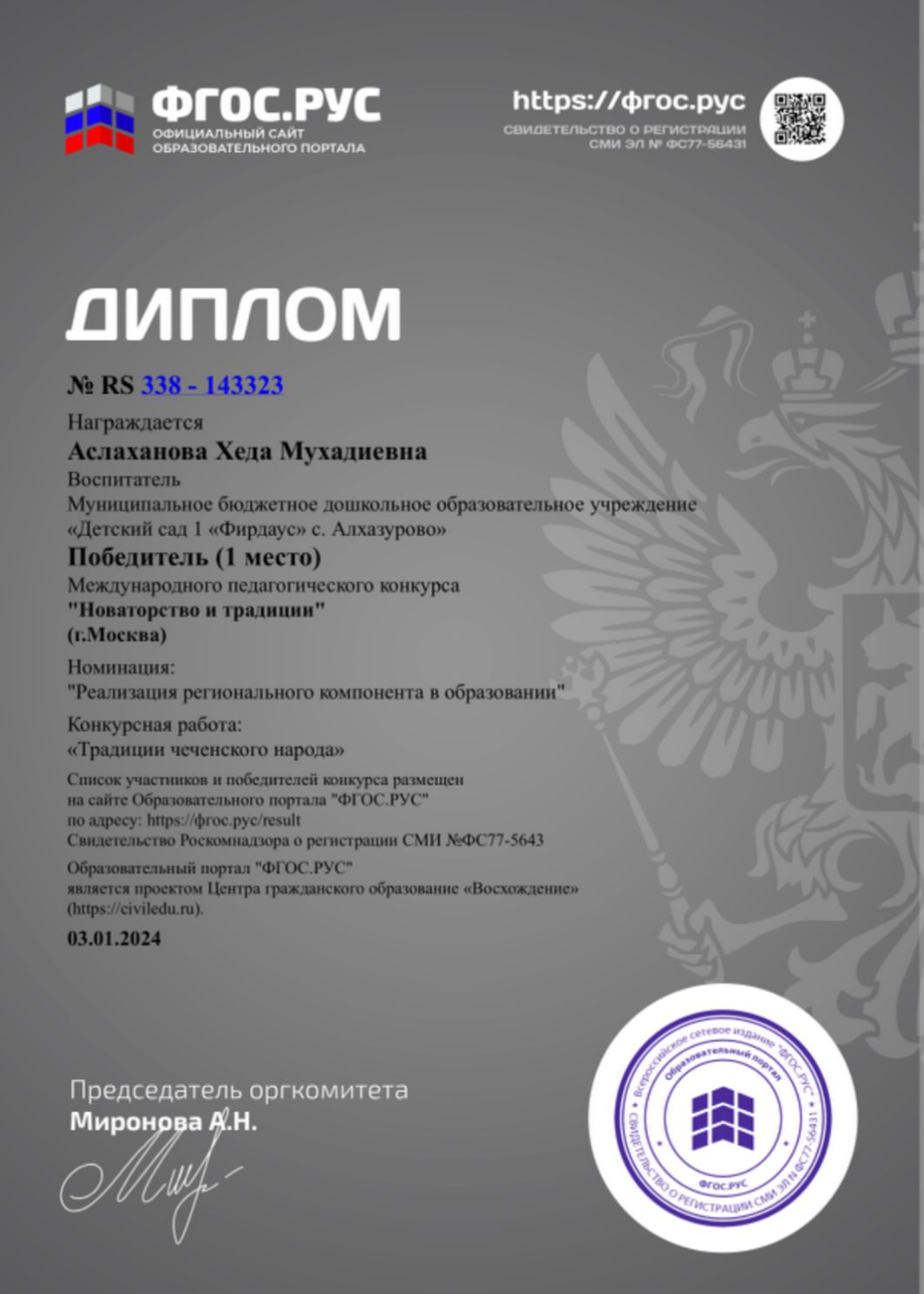Муниципальное бюджетное дошкольное образовательное учреждение «Детский сад №1"Фирдаус" с. Алхазурово Урус-Мартановского муниципального района»