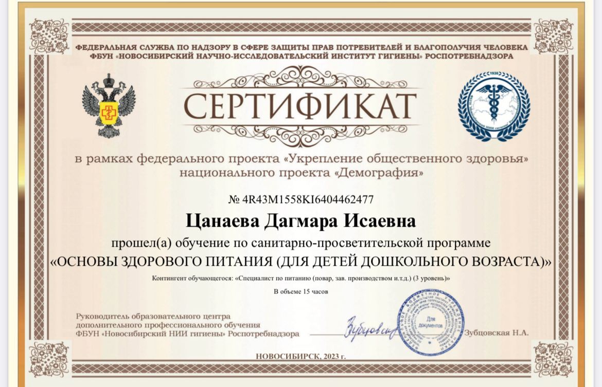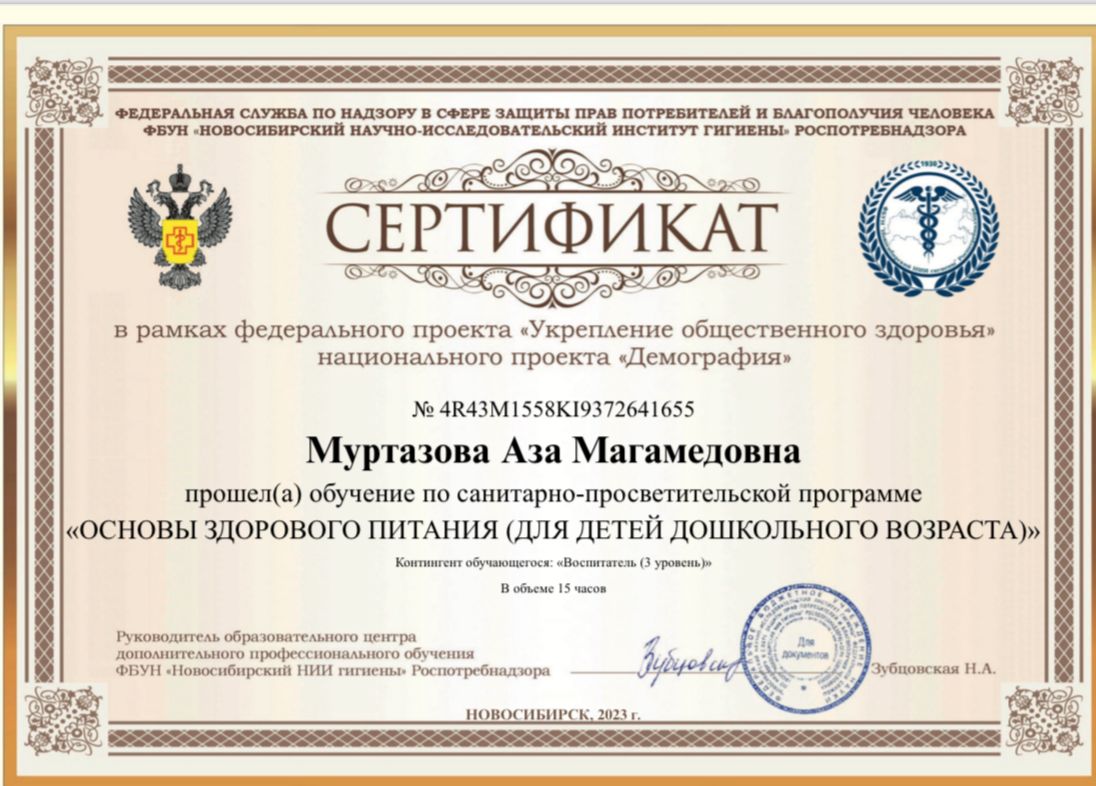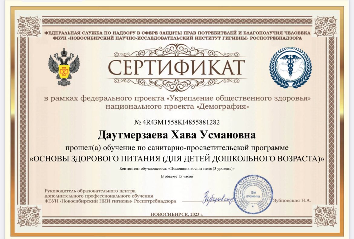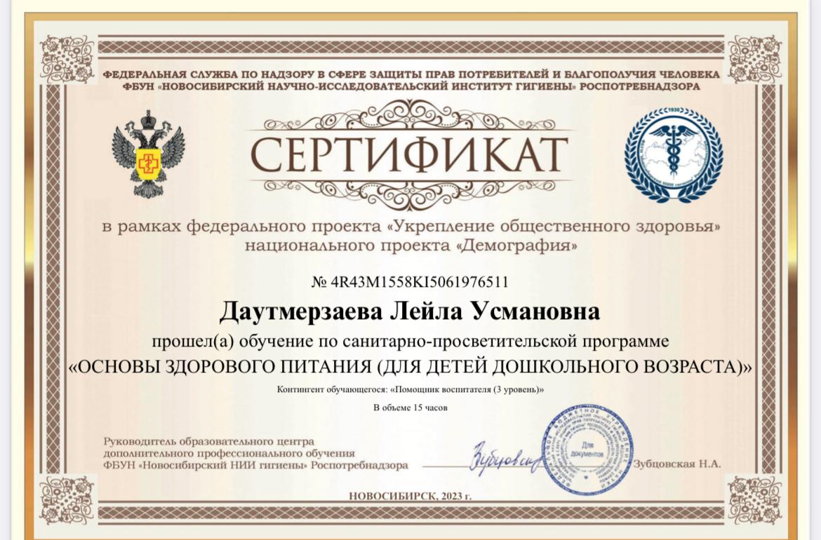 Сертификат о прохождении обучения «Основы здорового питания (для детей дошкольного возраста)»