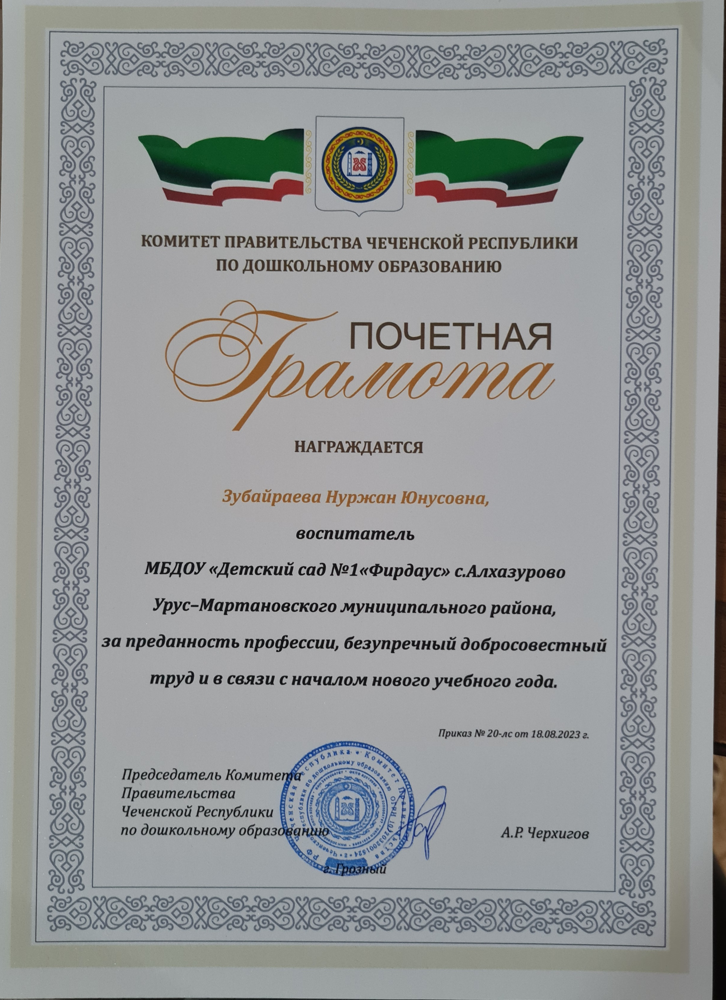 Грамота от Председателя КП ЧР по ДО Черхигова А.Р.