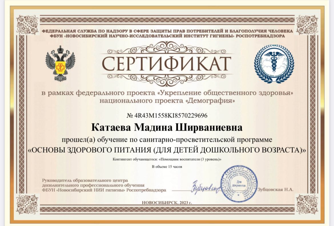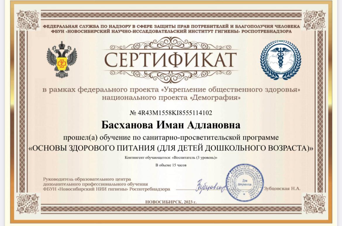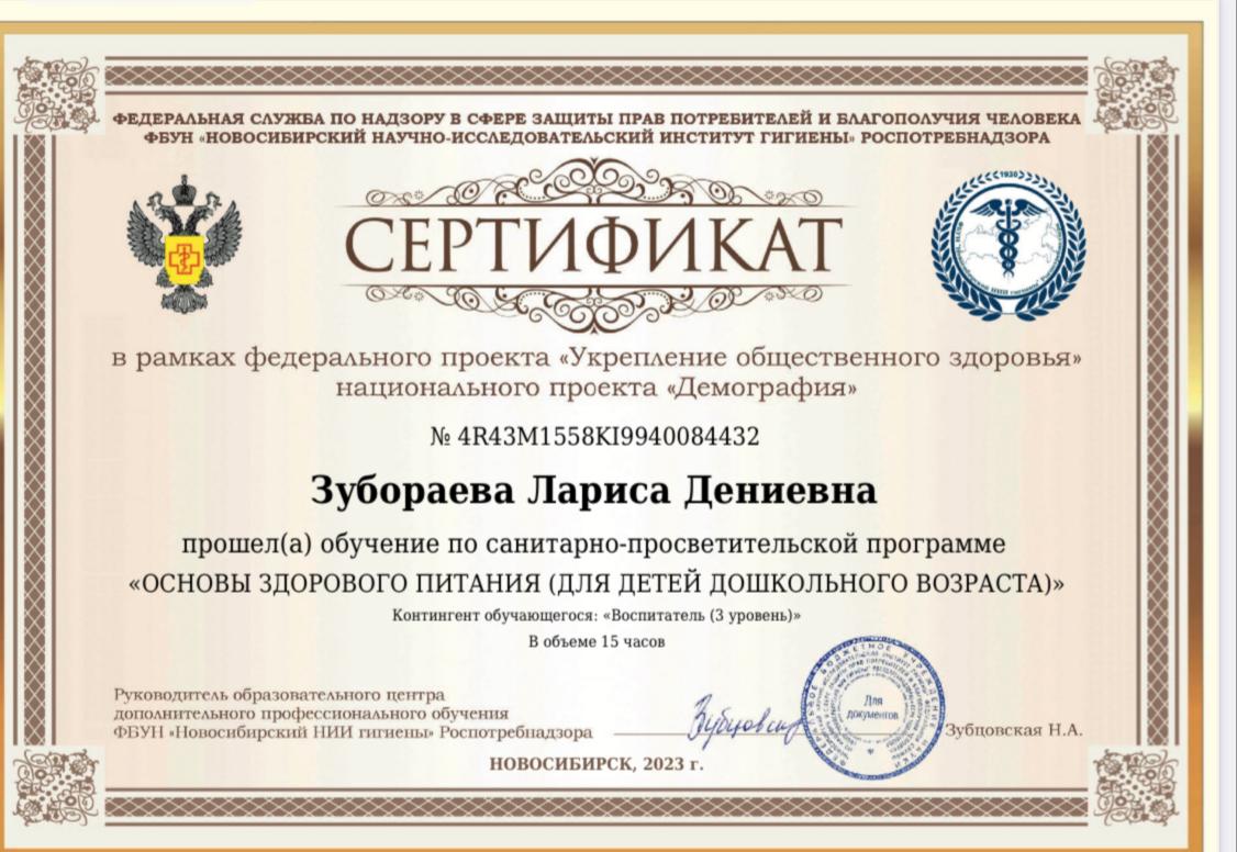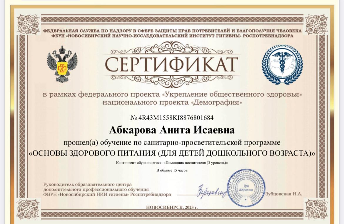 Сертификат о прохождении обучения «Основы здорового питания (для детей дошкольного возраста)»
