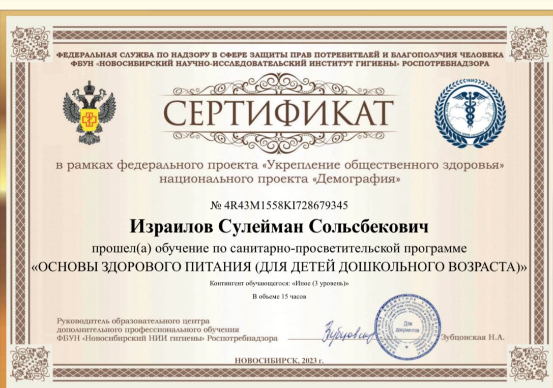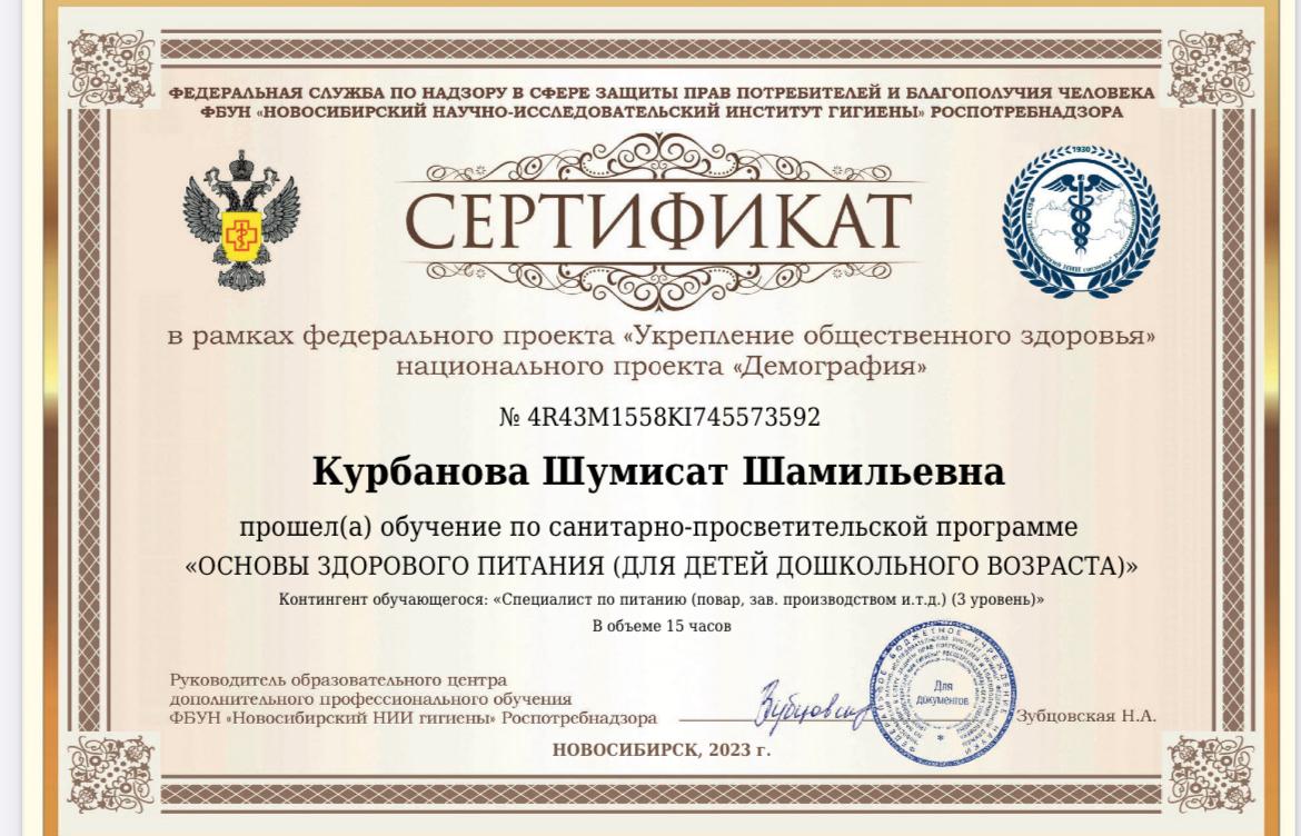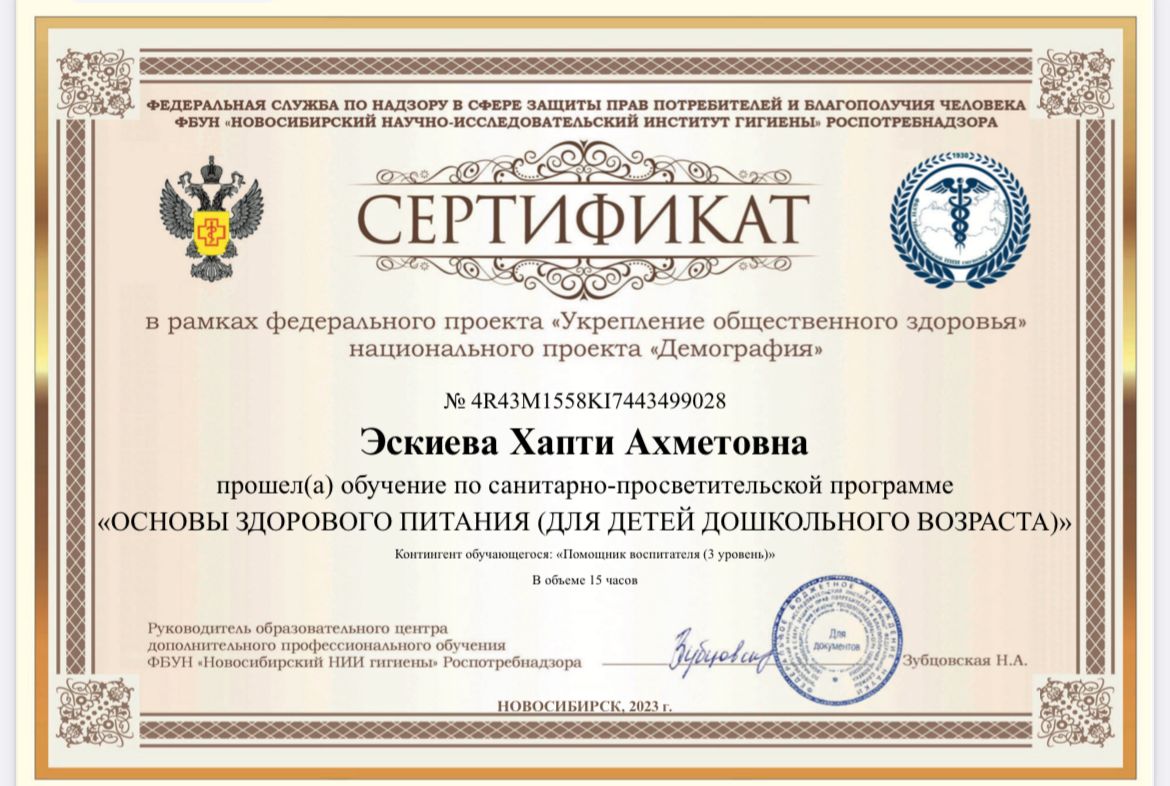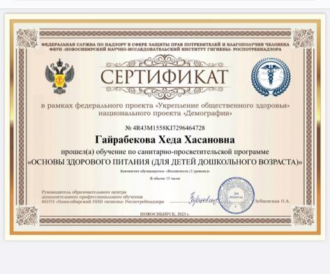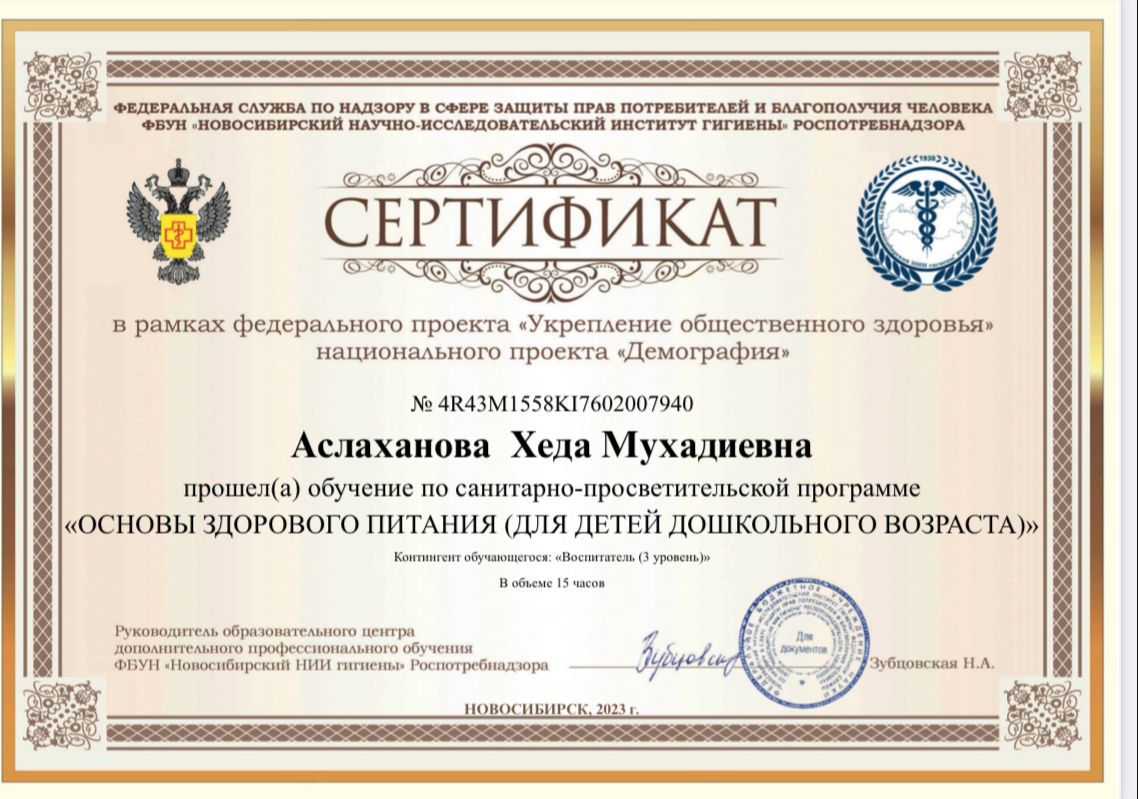 Сертификат о прохождении обучения «Основы здорового питания (для детей дошкольного возраста)»