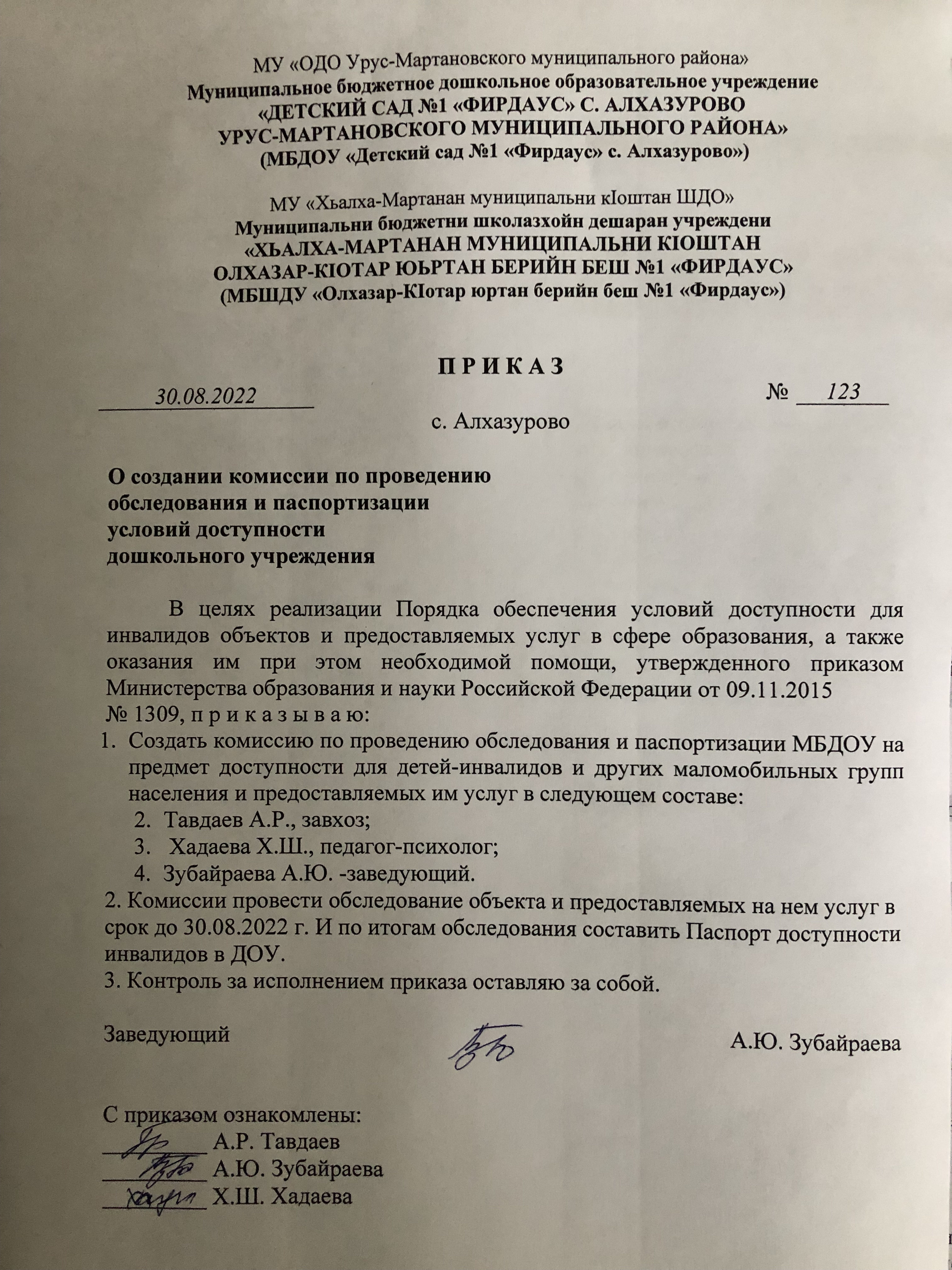 приказ о создании комиссии по проведению обследования и паспортизации условия доступности ДОУ